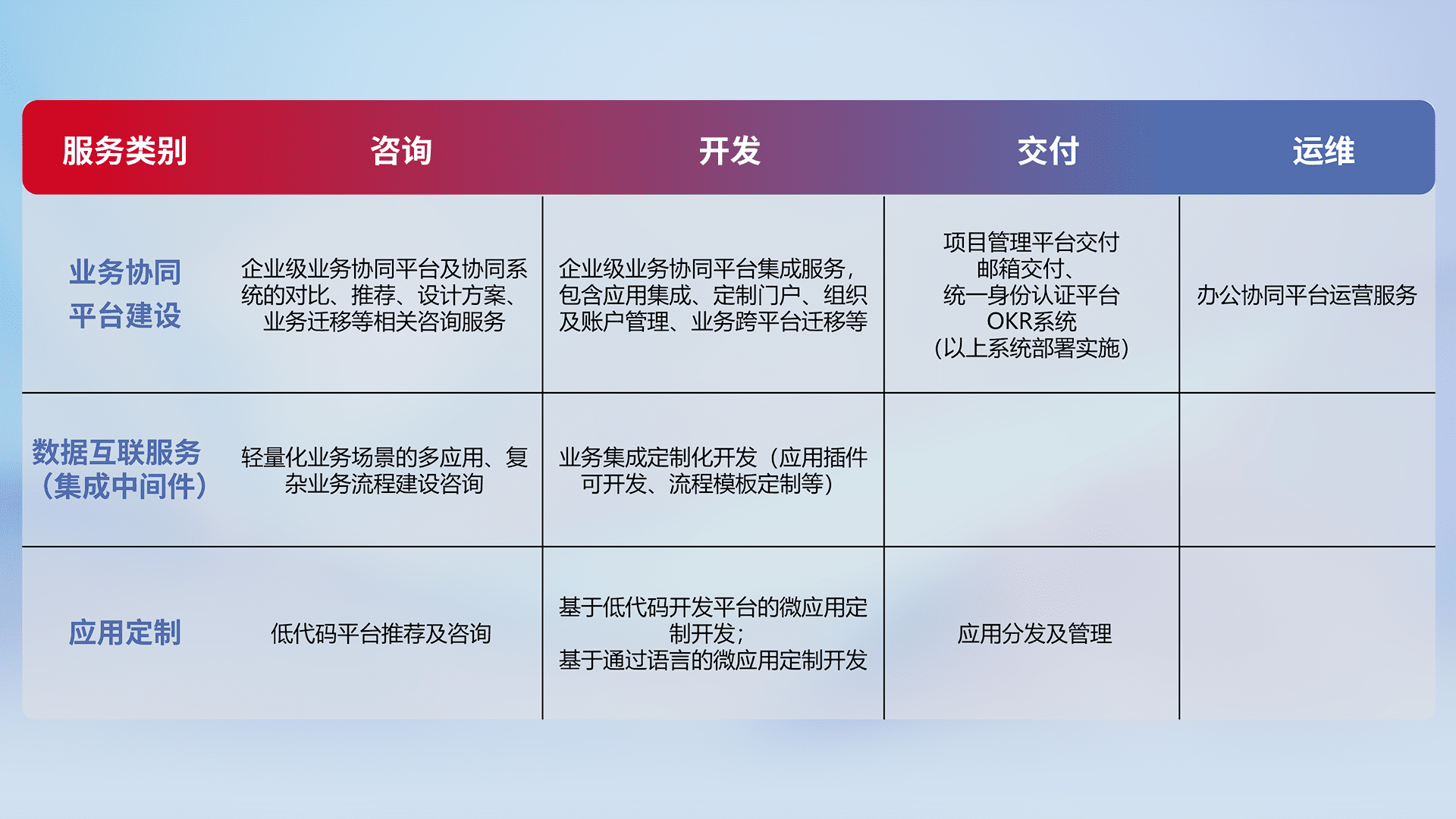 针对钉钉、、企微、、、、IDaas等平台级产品提供产品的规划、、方案、、、、交付、、、定制化开发等服务,,,实现如统一协同办公、、、、智能客户服务、、、混合会议管理、、、智能数据查询、、、、等业务场景,,,,实现数字化转型。。