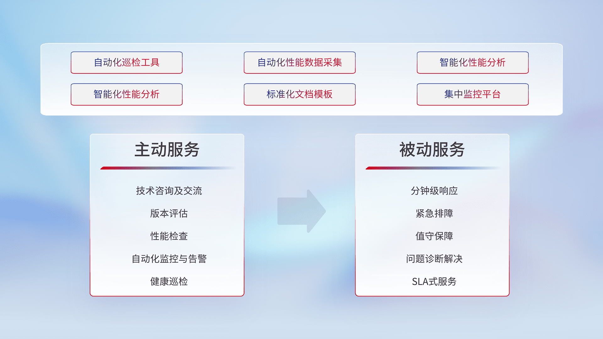 智能化工具和标准化文档,,,,保障服务质量,,,,提供主动服务(包含技术咨询、、、版本评估、、、、性能检查、、、自动化监控与告警、、、健康巡检)和被动服务包含(分钟级响应、、紧急排障、、、、值守保障、、、、问题诊断解决、、SLA服务)。。。